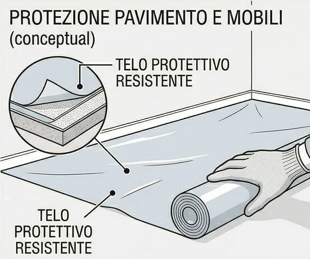 Prima di toccare qualsiasi componente, copri il pavimento e i mobili circostanti con un telo protettivo. Le operazioni di smontaggio, specialmente del telaio, producono polvere, frammenti di intonaco e potenzialmente schegge di vetro.