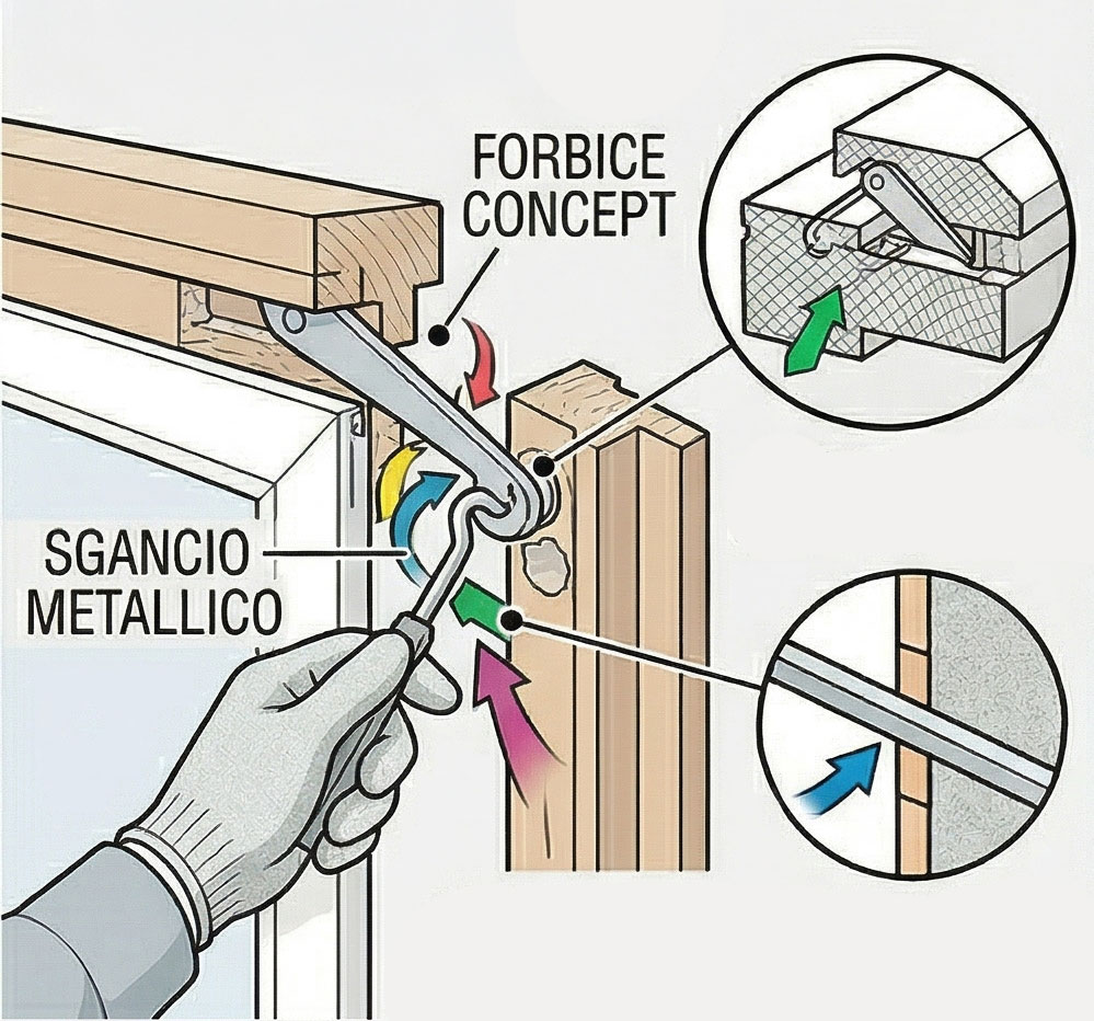- Individua la forbice — l’asta metallica che mantiene la finestra in posizione di ribalta, situata nella parte superiore — e sganciarla.