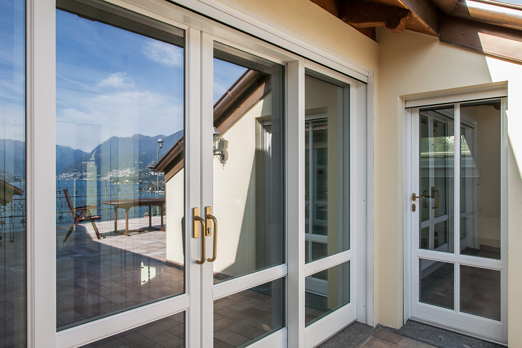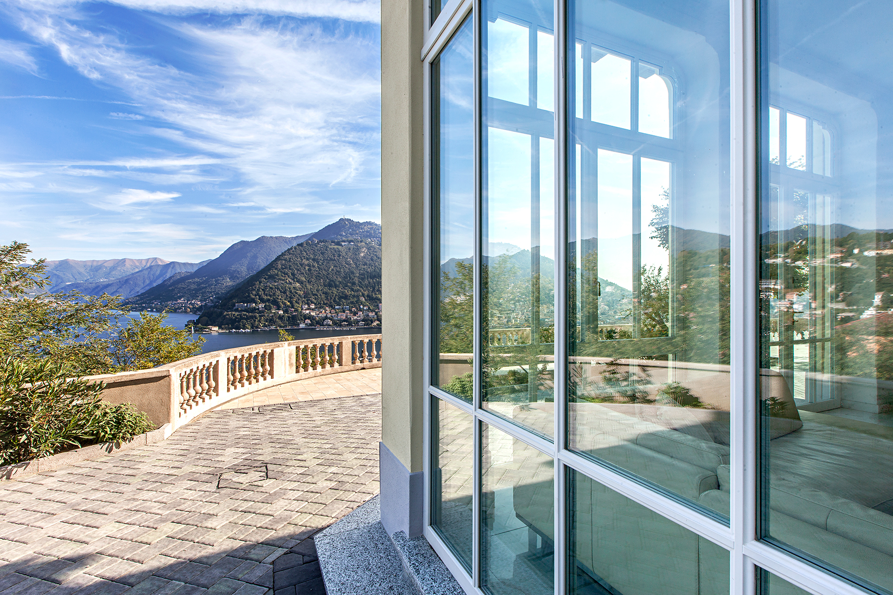L’intervento ha previsto la sostituzione completa dei serramenti originali con finestre e porte-finestre in legno laccato bianco, caratterizzate da profili con inglesine che richiamano fedelmente lo stile della villa ottocentesca. Nel salone principale, ampie vetrate su tre lati incorniciano la vista mozzafiato sul lago e sulle montagne circostanti, trasformando il panorama in un elemento protagonista degli interni.