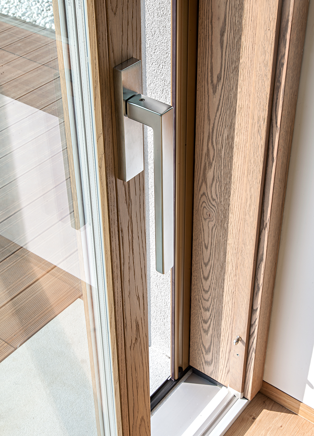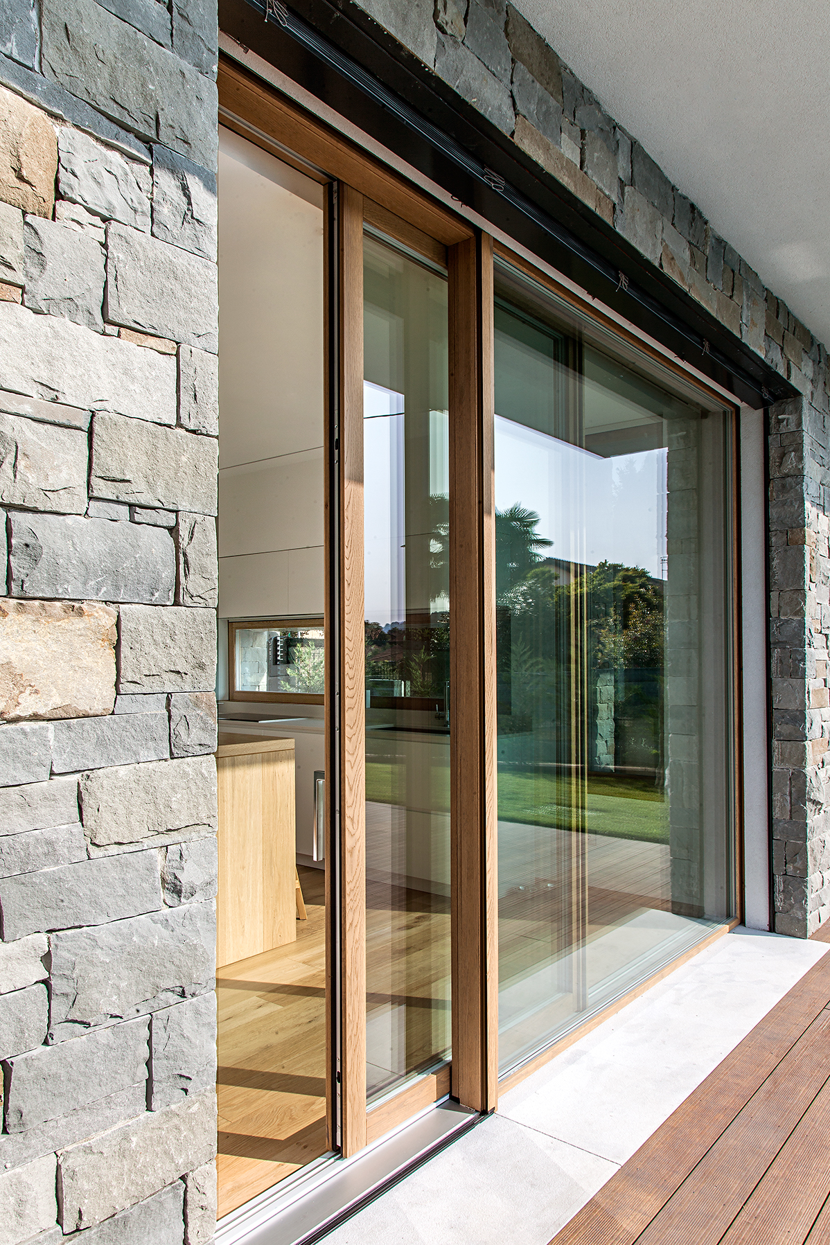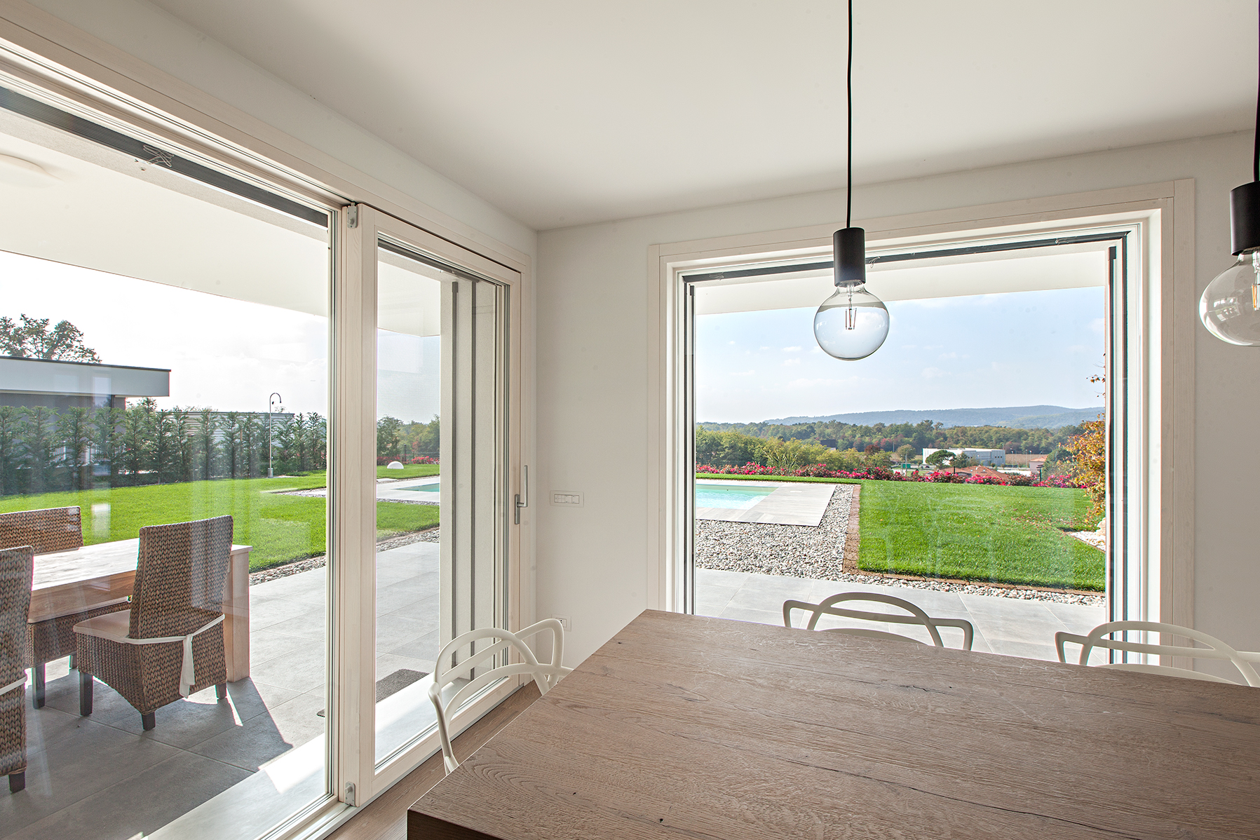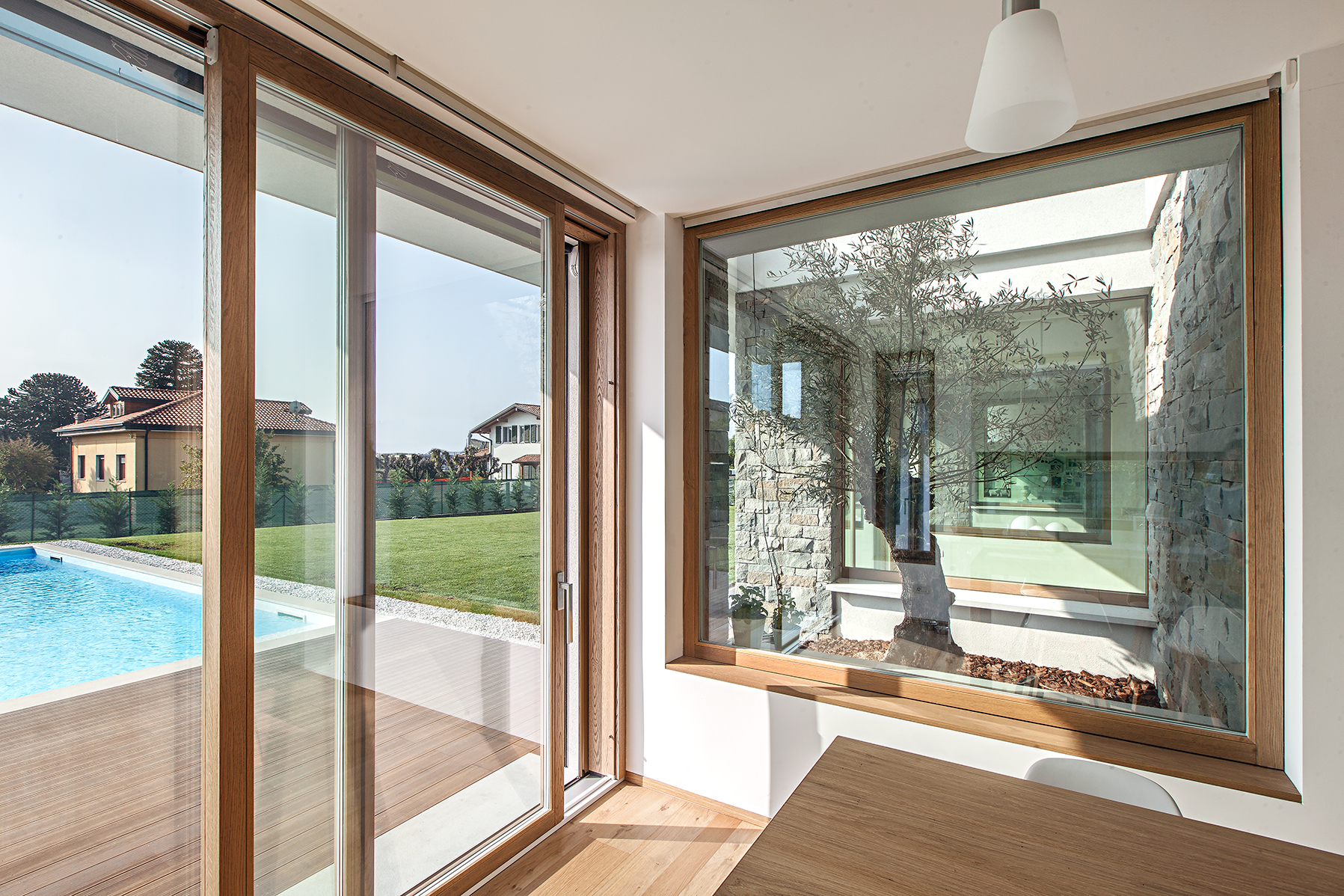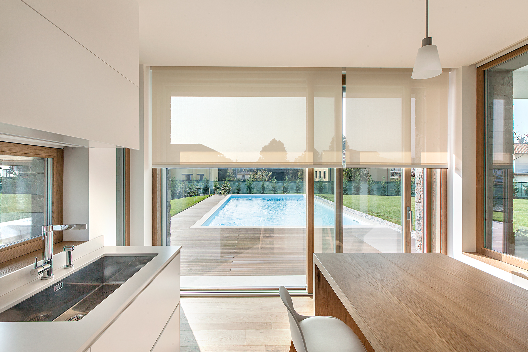 L’intervento ha previsto serramenti in legno-alluminio con interno in rovere naturale per le zone living e cucina, dove ampie porte-finestre scorrevoli collegano gli spazi abitativi alla terrazza e all’area piscina. Il giardino diventa così un’estensione naturale della zona giorno, con una continuità visiva tra interno ed esterno.