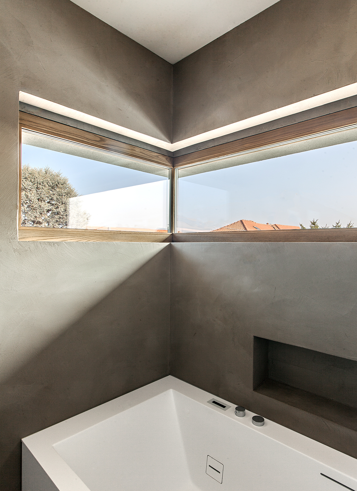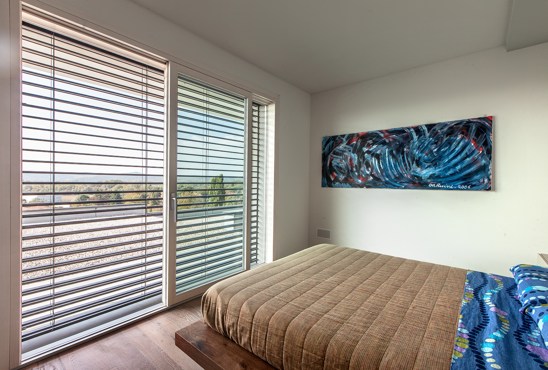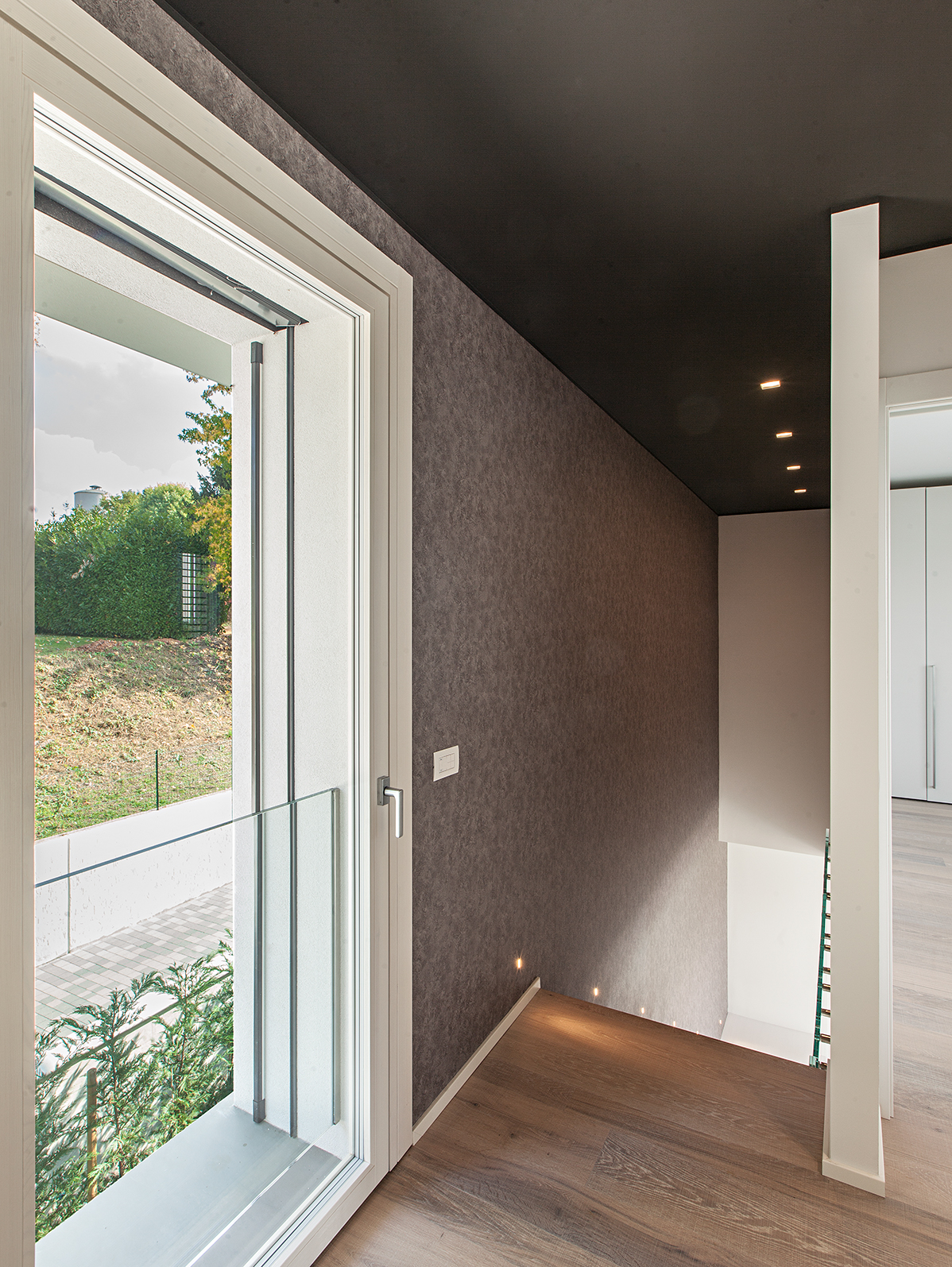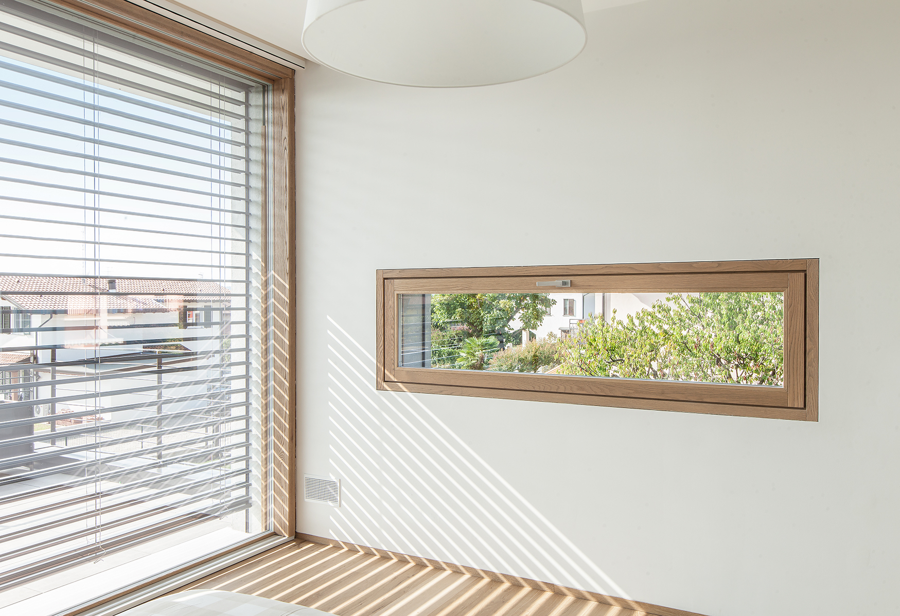 Particolare attenzione è stata dedicata al controllo solare con sistemi frangisole orientabili in alluminio antracite, integrati nelle facciate per regolare luminosità e temperatura interna. Elementi di design come la finestra angolare nella zona bagno e le finestre a nastro nelle camere conferiscono personalità architettonica agli ambienti, garantendo privacy senza rinunciare alla luce naturale.