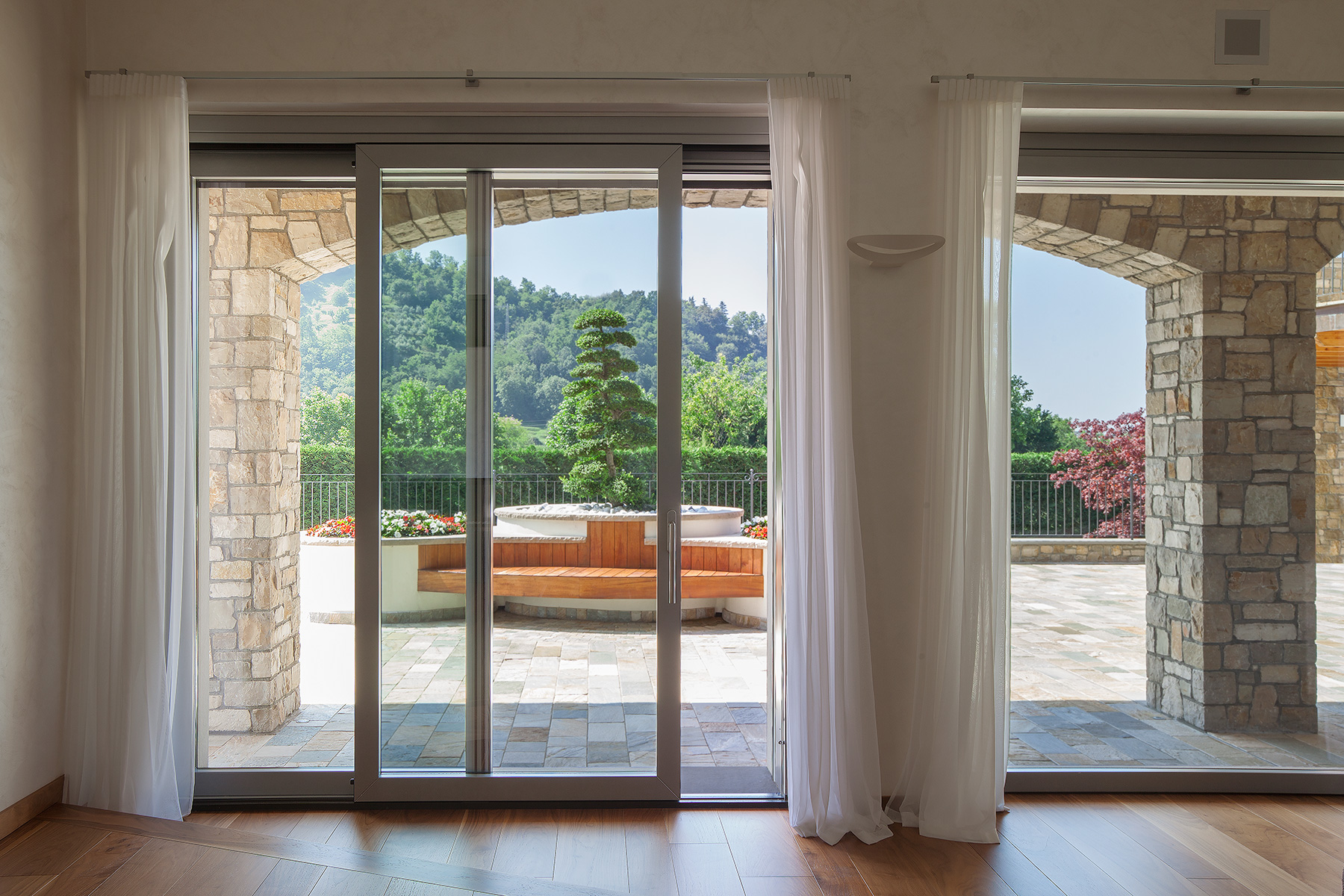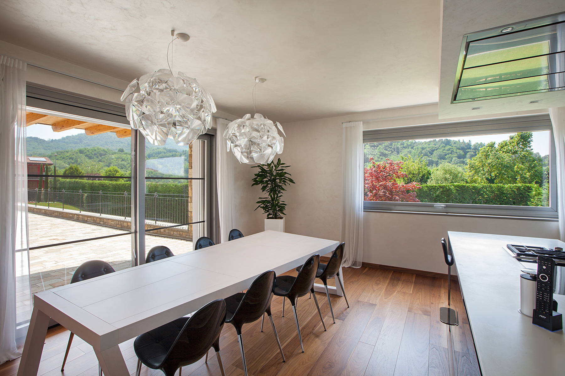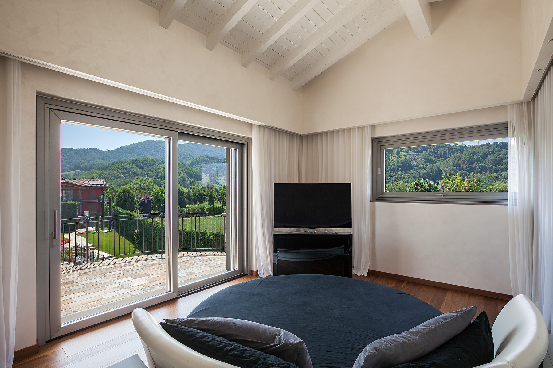 L’intervento ha compreso l’intera dotazione di infissi dell’abitazione: ampie porte-finestre scorrevoli con profili color antracite per la zona giorno, finestre a vasistas per la cucina con affaccio panoramico sulle colline, lucernari per massimizzare l’ingresso di luce naturale e porte interne vetrate per la zona wellness.