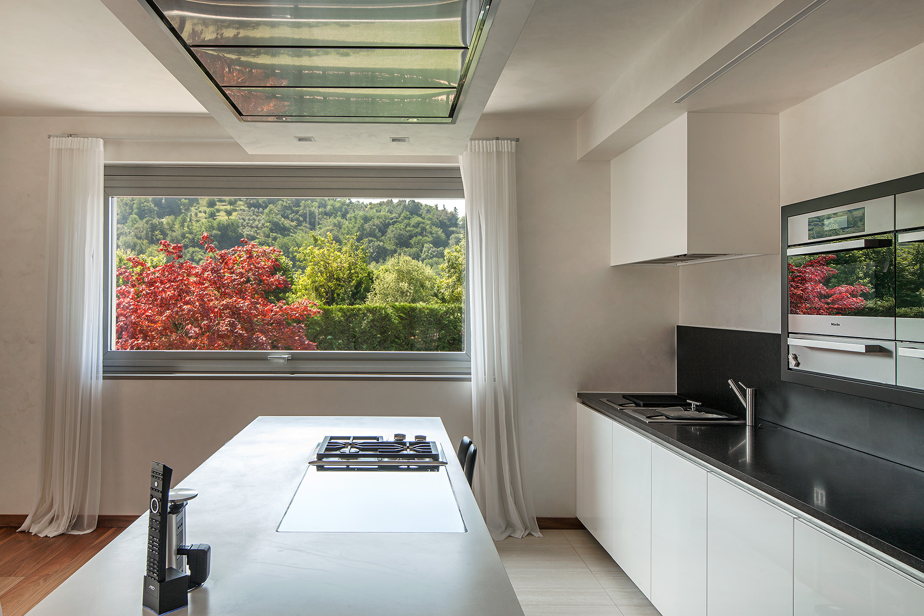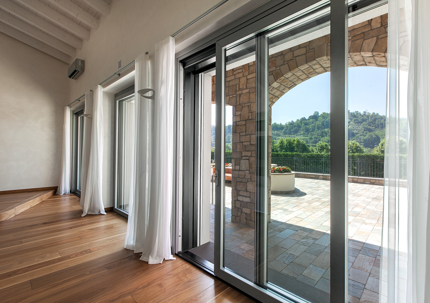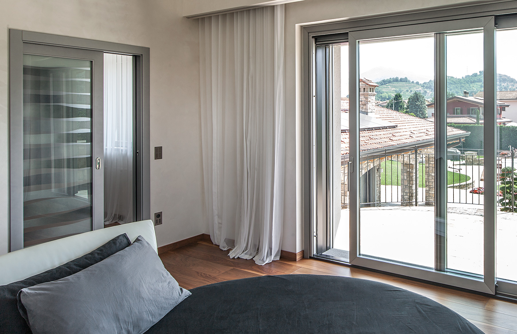 L’intervento ha compreso l’intera dotazione di infissi dell’abitazione: ampie porte-finestre scorrevoli con profili color antracite per la zona giorno, finestre a vasistas per la cucina con affaccio panoramico sulle colline, lucernari per massimizzare l’ingresso di luce naturale e porte interne vetrate per la zona wellness.