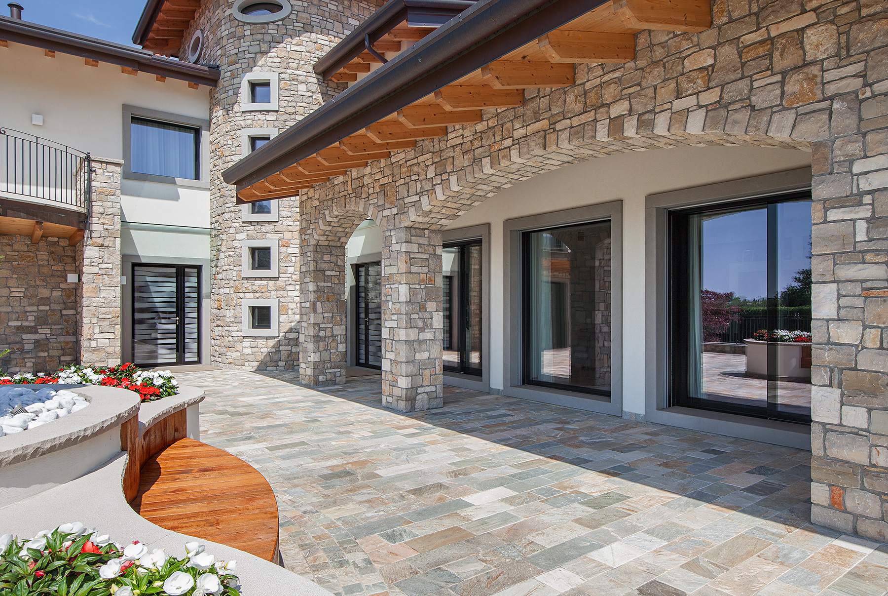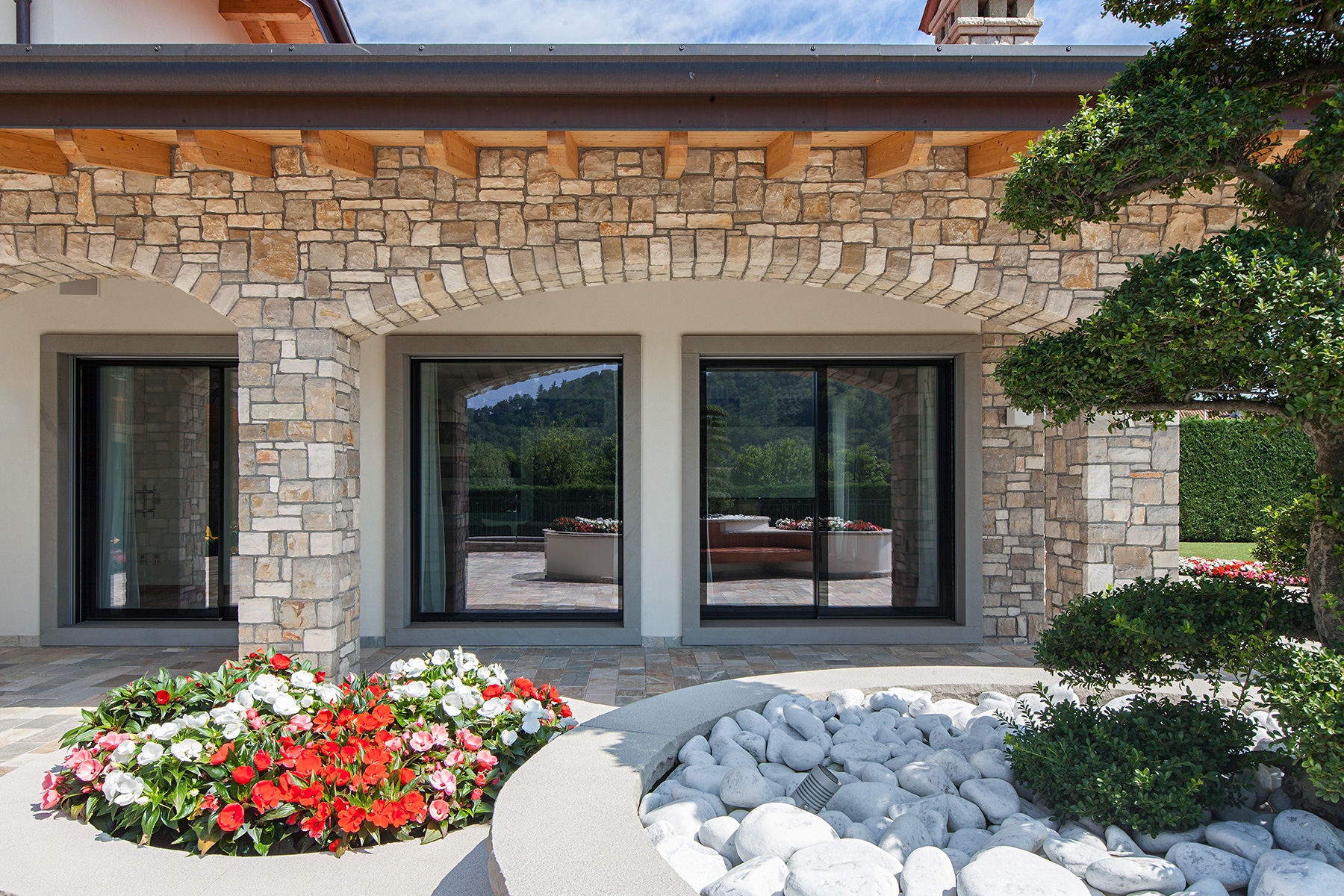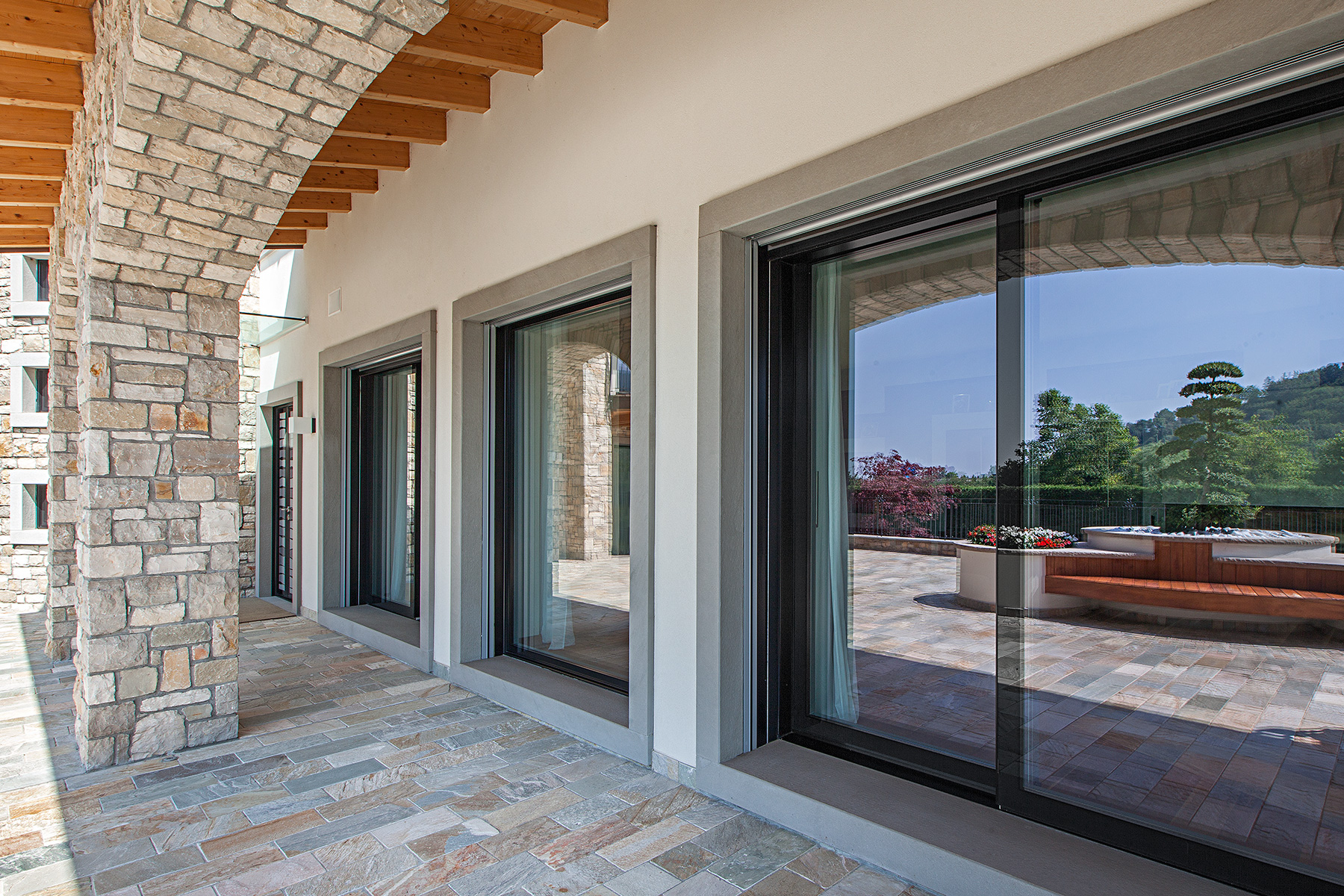 La scelta di serramenti con profili scuri crea un raffinato contrasto con la pietra chiara della facciata, valorizzando l’architettura rustica contemporanea della villa. Le grandi superfici vetrate collegano visivamente gli ambienti interni con il porticato esterno e il giardino circostante, offrendo una vista privilegiata sul paesaggio collinare bergamasco.