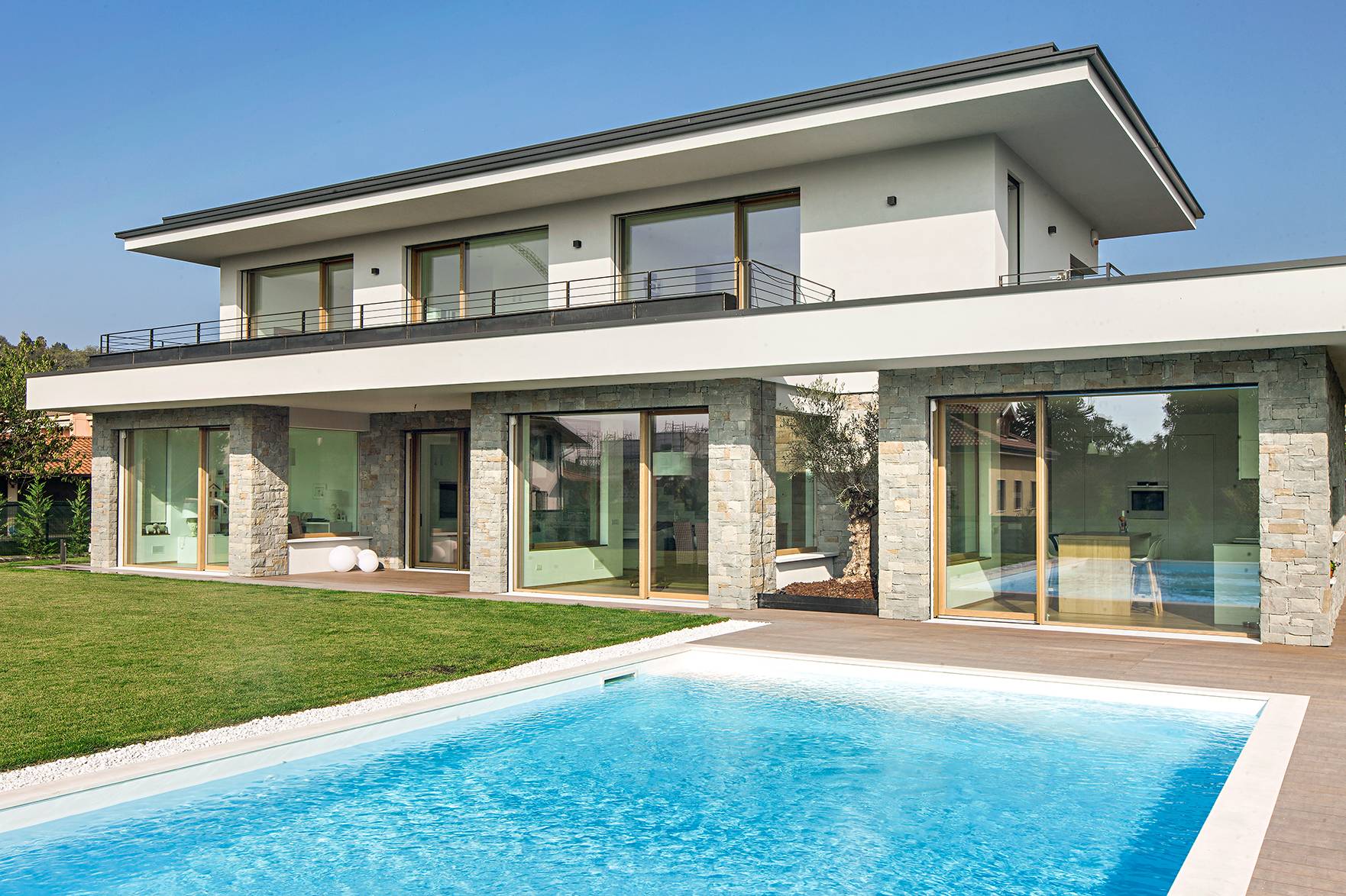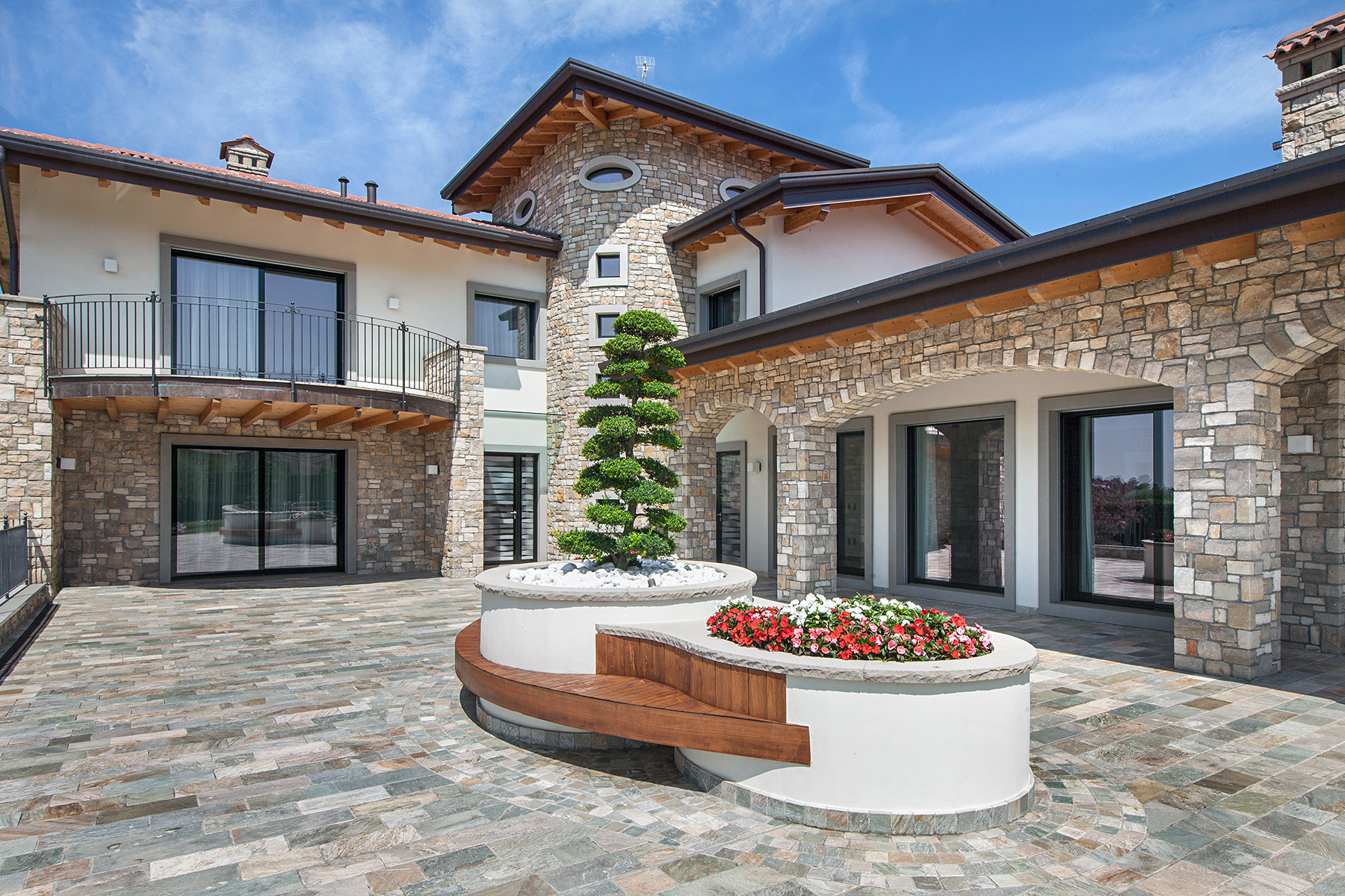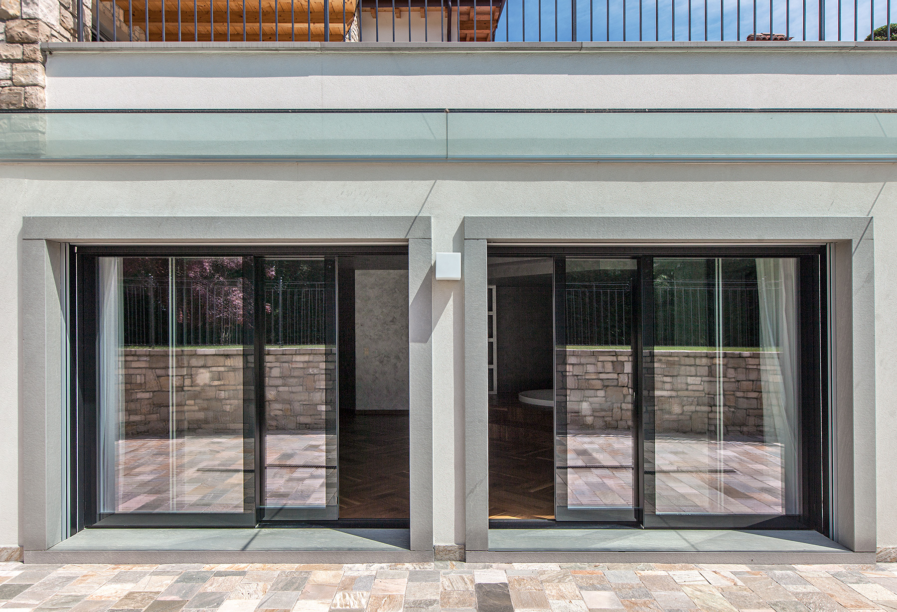 La scelta di serramenti con profili scuri crea un raffinato contrasto con la pietra chiara della facciata, valorizzando l’architettura rustica contemporanea della villa. Le grandi superfici vetrate collegano visivamente gli ambienti interni con il porticato esterno e il giardino circostante, offrendo una vista privilegiata sul paesaggio collinare bergamasco.