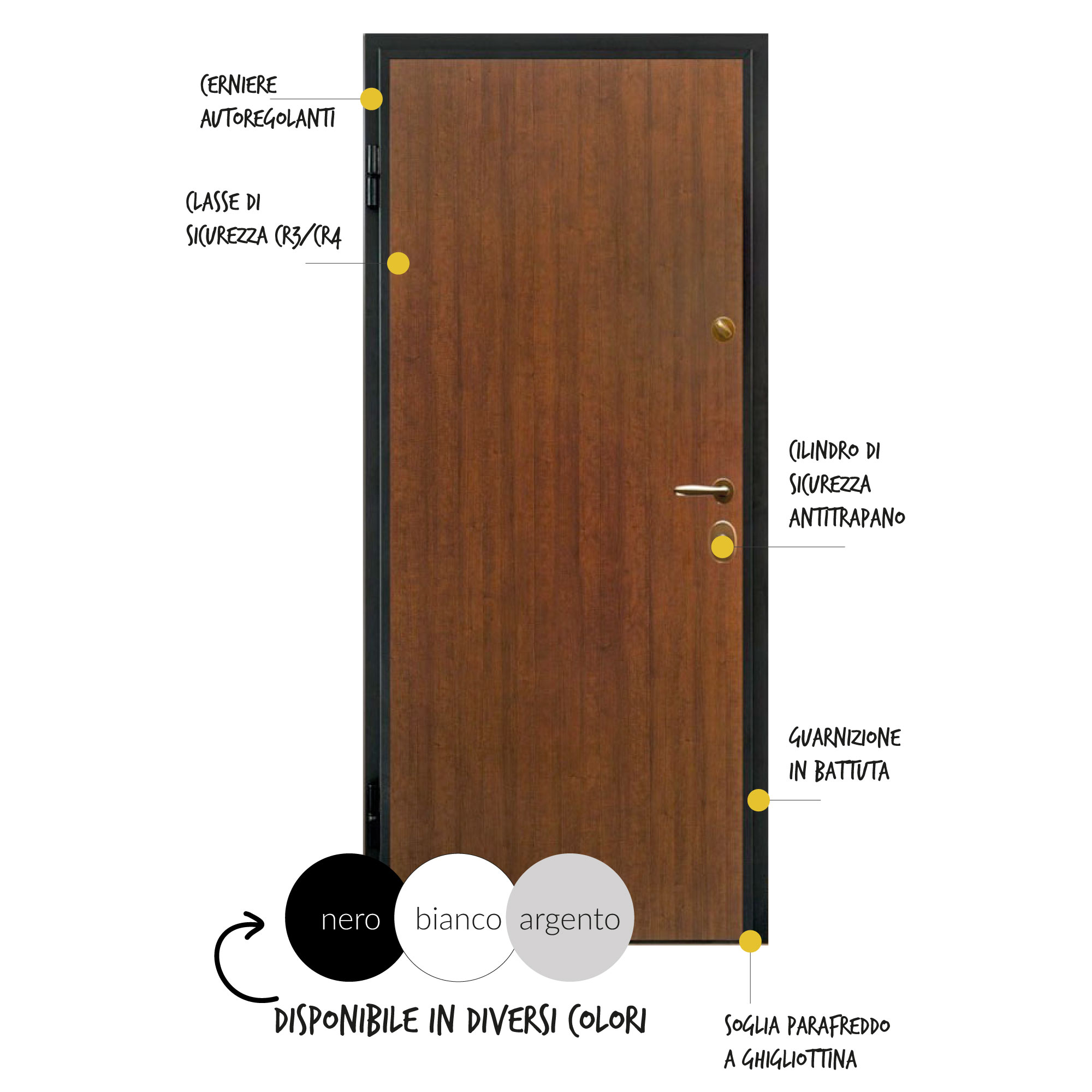 - Accessori: soglia paraspifferi, guarnizioni perimetrali, spioncino grandangolare, gancio sicurezza