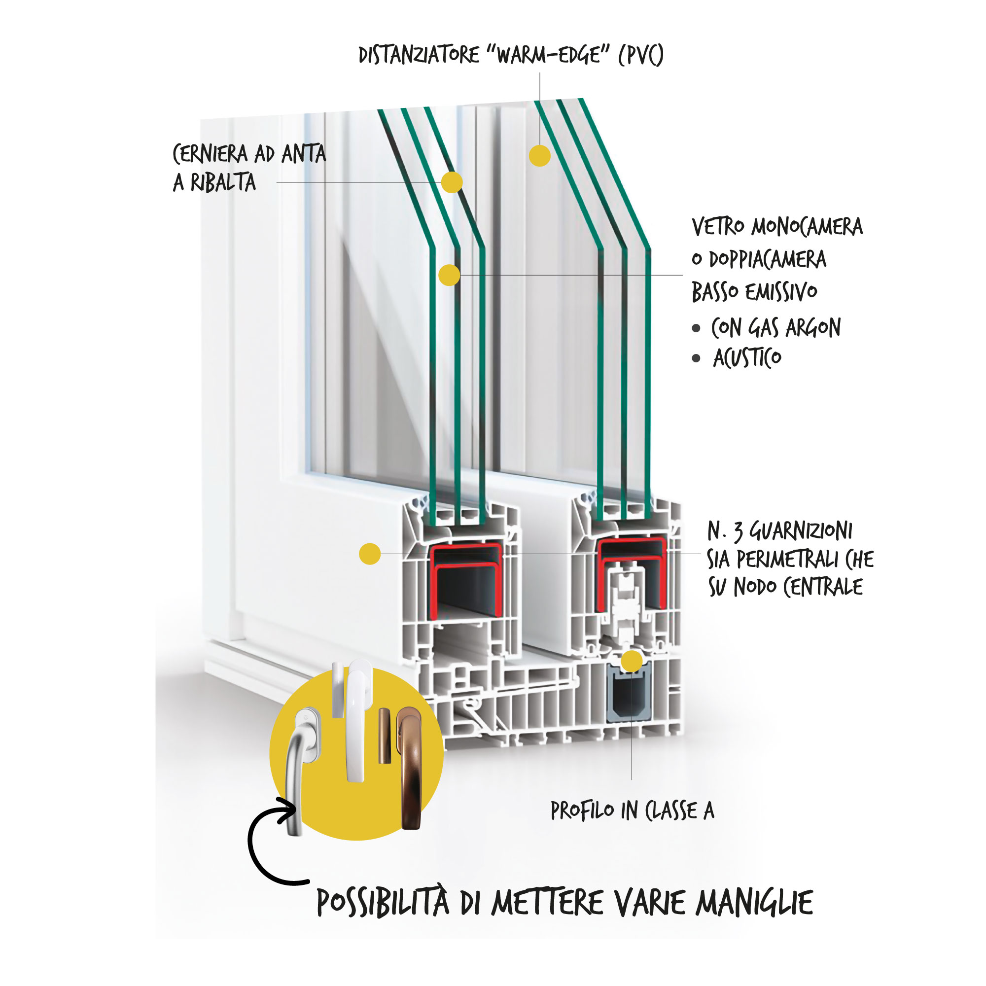 - Materiale: profili estrusi PVC classe A, mescole classe S